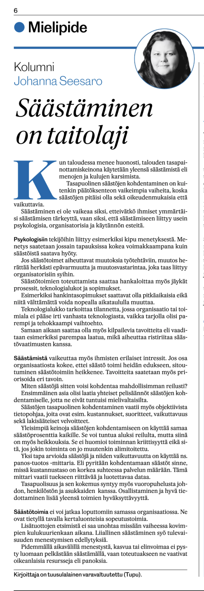 Varavaltuutettumme Johanna Seesaro muistuttaa, että talouden heiketessä säästöjä haetaan usein menoja karsimalla, mutta vaikeinta on kohdentaa leikkaukset oikeudenmukaisesti ja vaikuttavasti.